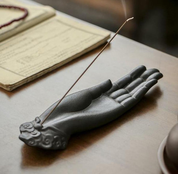 Bring tranquility and style to your space with this Ceramic Buddha Hand Incense Burner. This incense burner features a peaceful Buddha hand, a perfect base to catch ash and keep your space tidy.