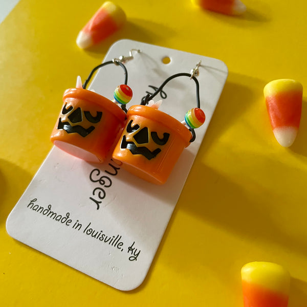 The "sweetest" candy filled jack-o'-lantern pails hang from lead and nickel free silver plated fishhooks.